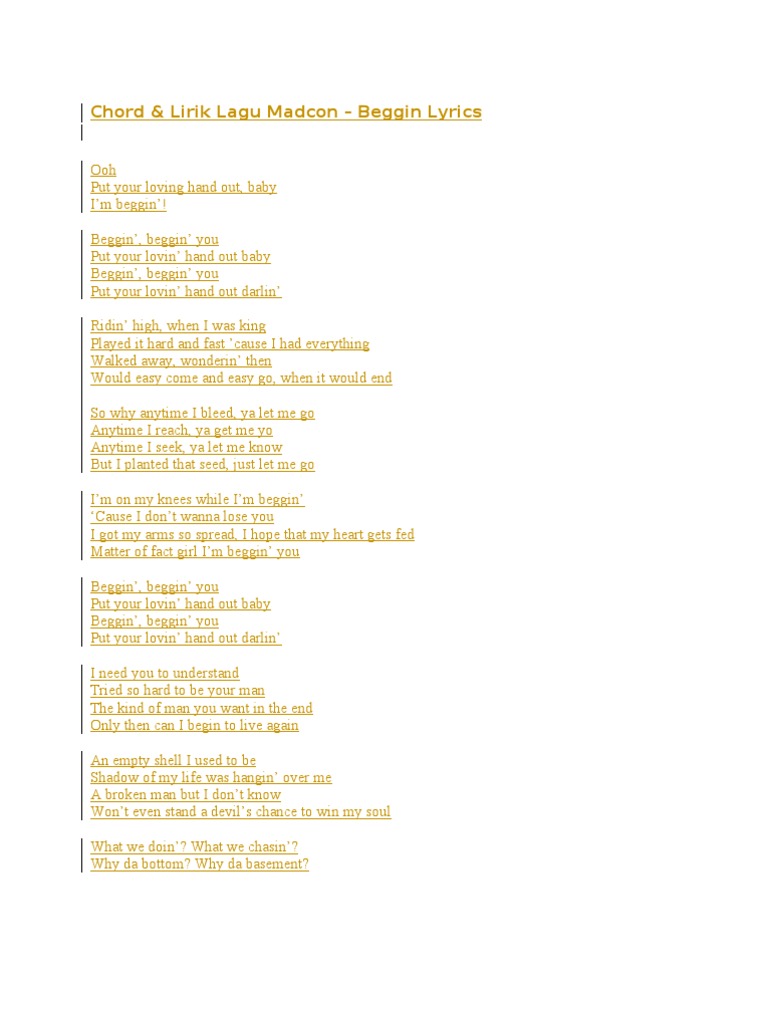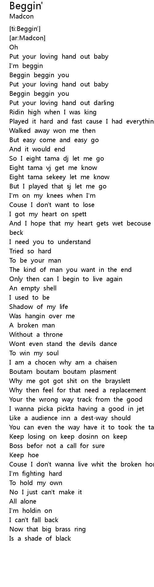 Beggin Lyrics / M ► madcon ► beggin'.. This song is a cover of beggin' by the four seasons. 272,307 views, added to favorites 3,391 times. Tshawe baqwa:oohput your lovin' hand out, babyi'm begging. Tshawe baqwa] ridin' high, when i was king played it hard and. @ristotaks would really appreciate that!